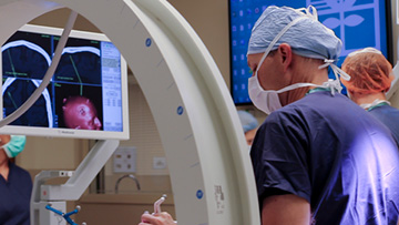 The extraordinary high-resolution visualization of the brain’s vascular network made possible by the imaging technology is assisting surgeons in managing stroke cases as well. With a fellowship-trained stroke neurologist, Wolfgang Leesch, MD, a neuroradiologist and a neurosurgeon on hand, stroke victims get the benefit of three different perspectives. The images revealed on the computer screen help surgeons guide catheters directly to the clot with pinpoint accuracy, allowing its removal from the brain. The formerly ominous empty space on x-ray, once blocked by the clot, is filled with vasculature as blood flows freely again.