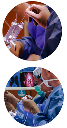 Using MRI imaging and stereotactic techniques, the surgeon guides an electrical stimulation lead to a target deep within the brain in the area of the thalamus. The target areas for Essential Tremor and Parkinson’s are in relatively close proximity within the brain, but they are decidedly different in their functions and in the effects of treatment. Thus precision in reaching the appropriate target is critical.
